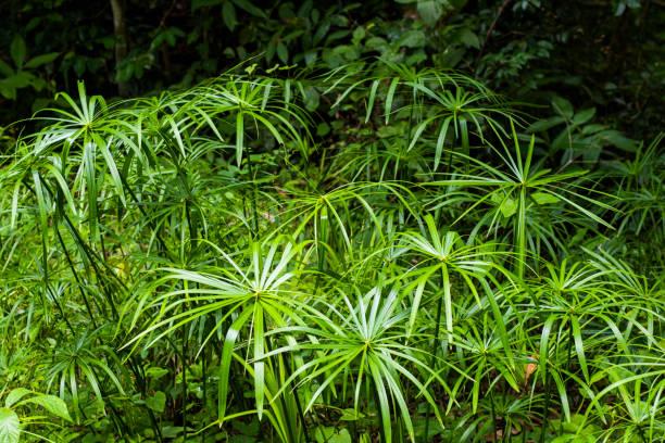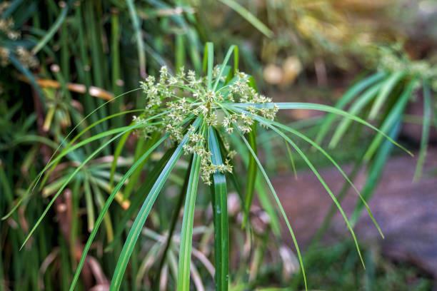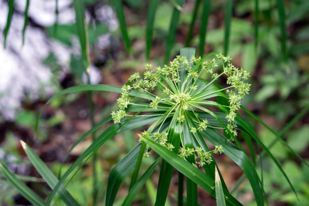 Este ejemplar pertenece a la familia de las ciperáceas. Es robusta y se desarrolla a partir de rizomas cortos, dando origen a tallos que oscilan entre 60 y 150 centímetros de altura. Su rasgo distintivo radica en sus hojas, que se despliegan de forma radial, evocando la apariencia de las varillas de un paraguas, de donde provienen sus nombres comunes.